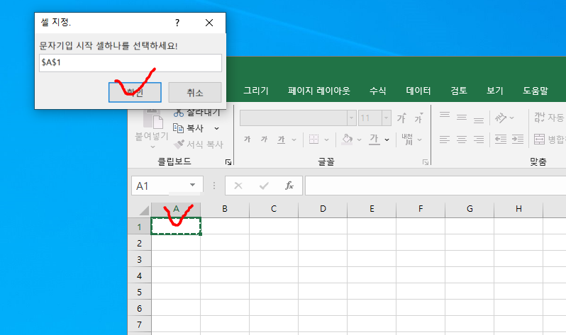 14. 첫 번째 열, 첫 번째 행 ($A$1) 하나만 선택하고 '확인 버튼을 누릅니다.