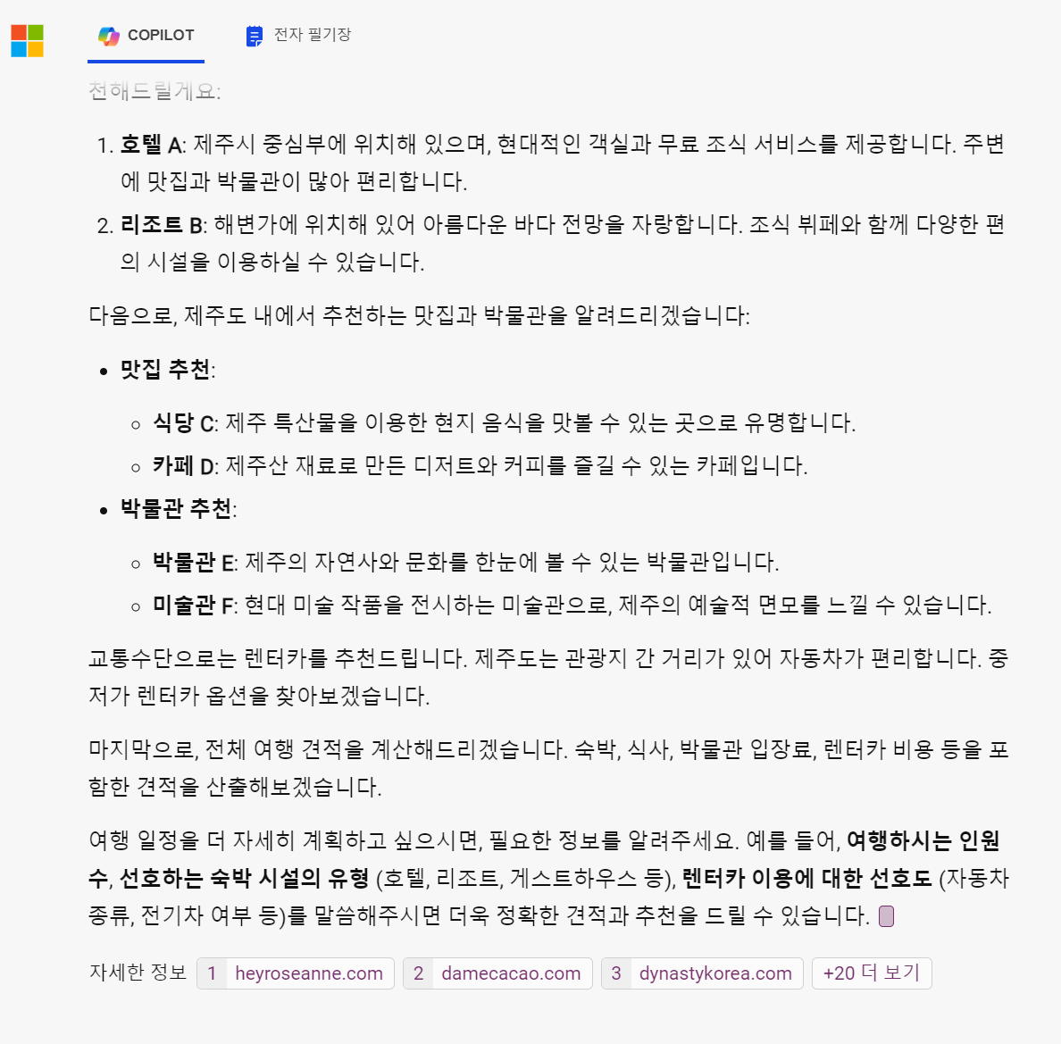 "초여름 제주도 4박5일 여행코스, 맛집과 박물관 위주로, 평일 기준으로 중저가 자유여행, 숙박 및 교통 예약, 숙박은 2곳을 2박씩 나눠서, 조식 포함, 견적도 포함해서 알려줘"라고 요청해봤습니다.