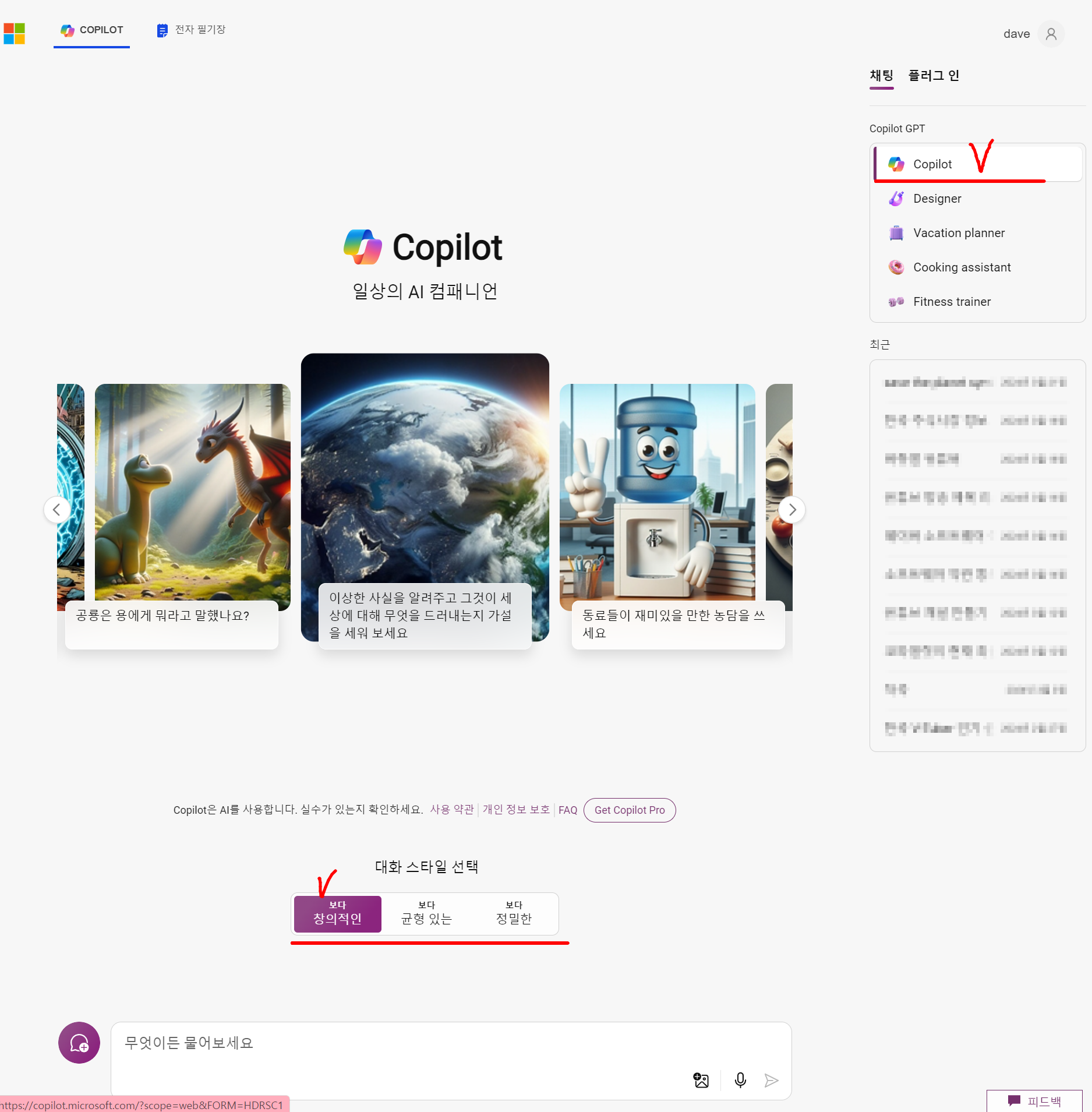 3. 우측 Copilot GPT 에 다양한 메뉴가 있습니다.