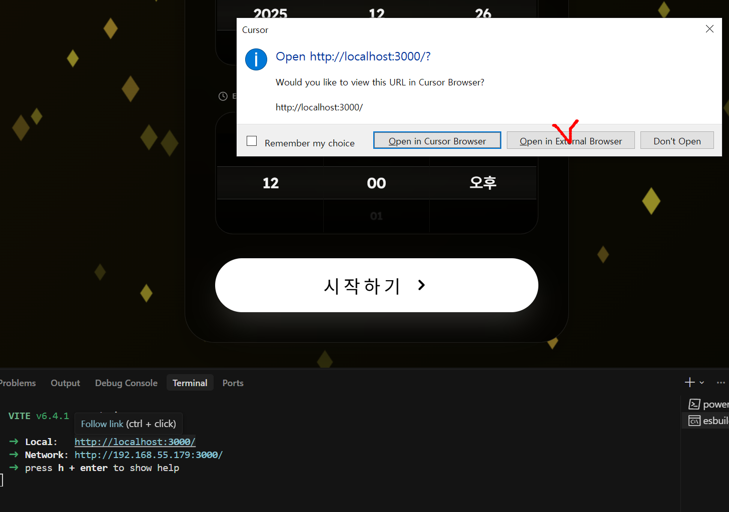 Teminal = cmd로 설정해두기!! (커서 ai 경우 터미널이 power shell로 처음 열린다. 여기에 암만 쳐봐도 되지 않는다)