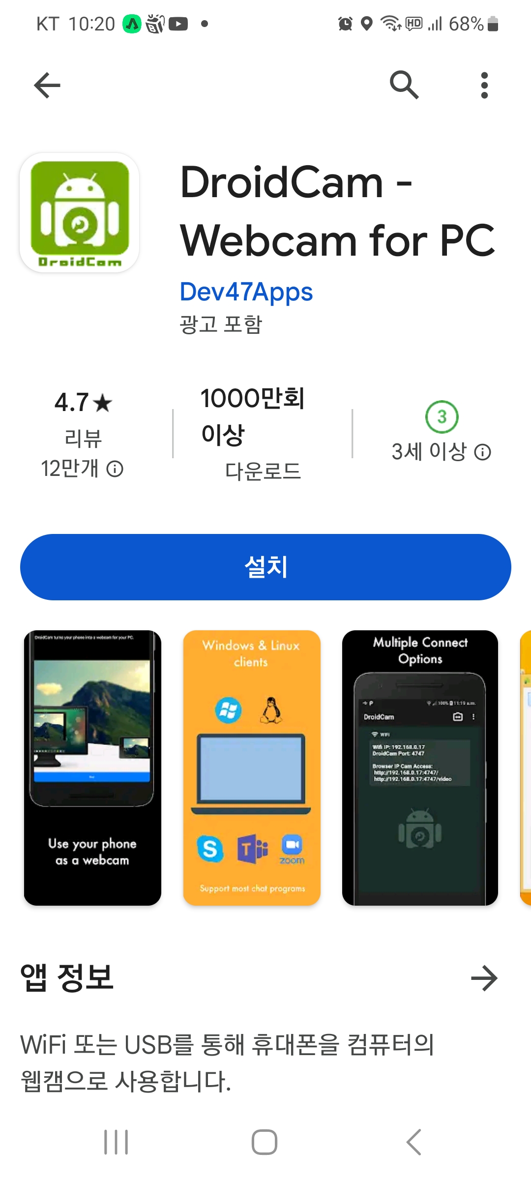 1. 안드로이드 폰에서 앱을 다운로드합니다. "DroidCam" 검색