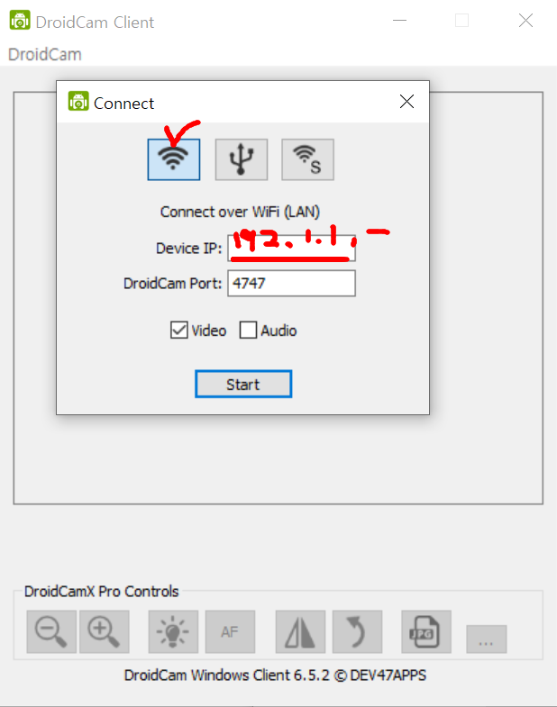 2) PC의 DroidCam Client를 설치하고 실행하면 아래와 같이 뜨고, IP입력란에 그대로 써넣습니다.