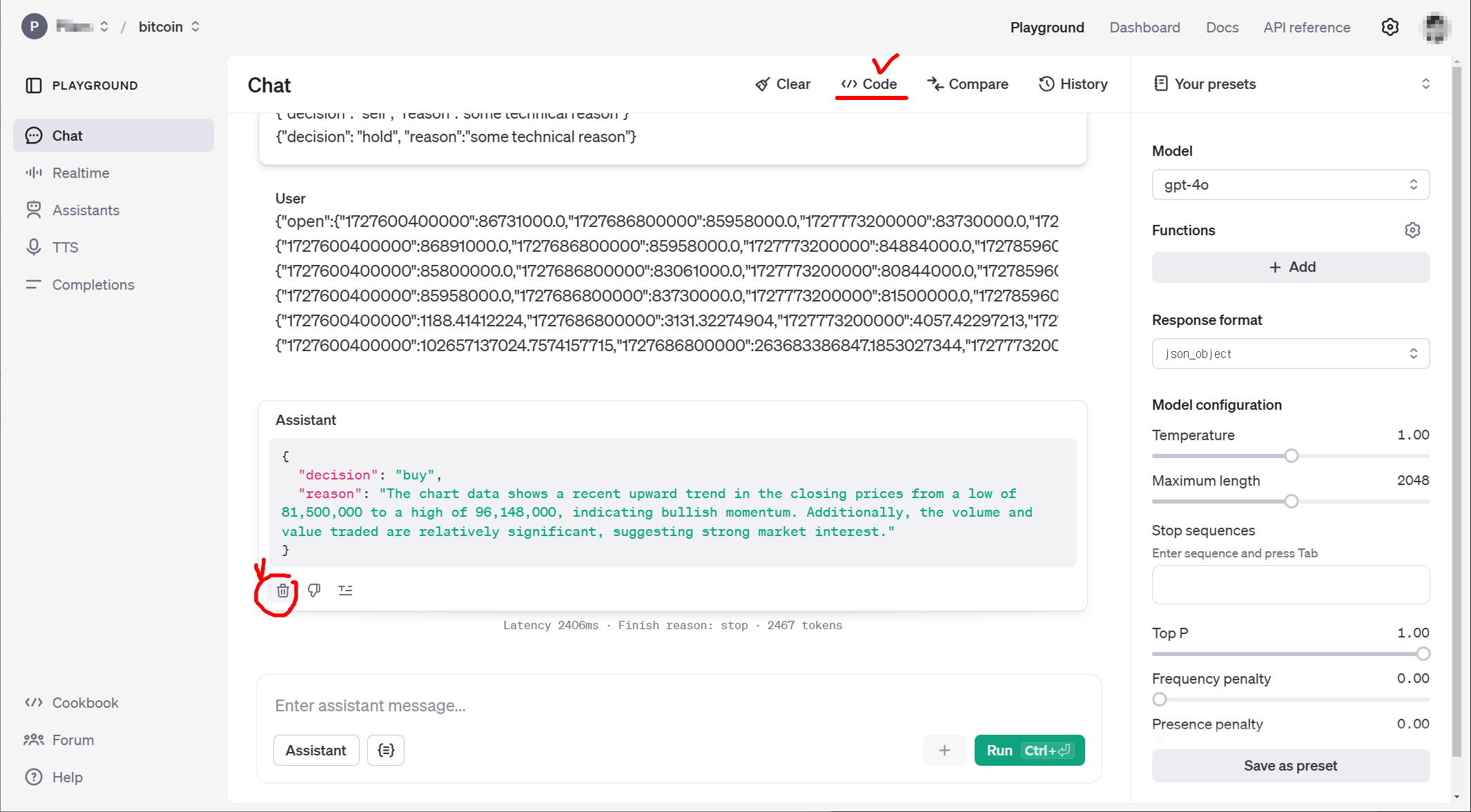 1) Assistant 의 답변은 삭제(휴지통 아이콘) 한 후, 우측 상단의 'Code' 를 클릭합니다