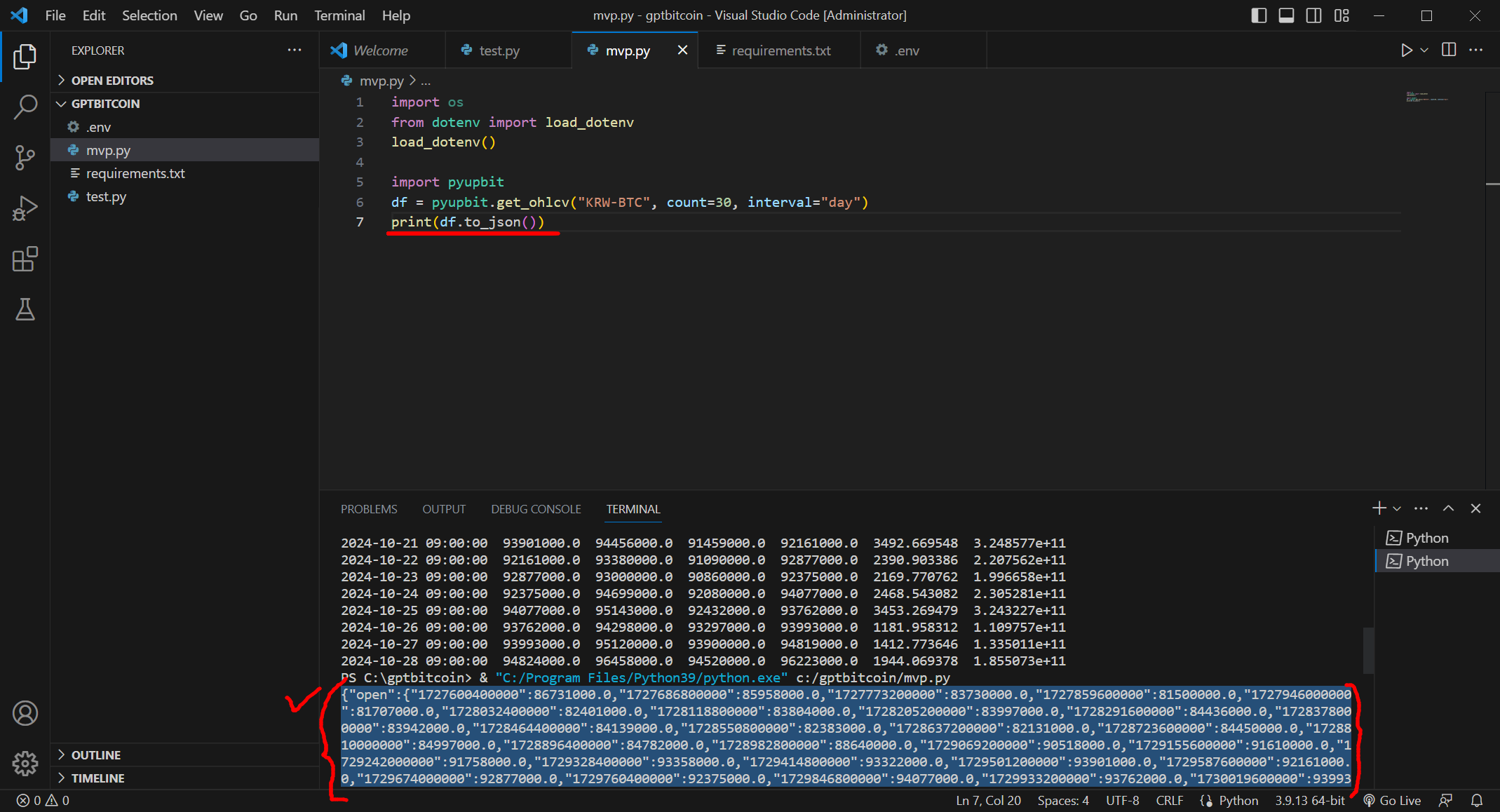이렇게 웹사이트가 아닌, 파이썬 프로그래밍으로 출력해 보는 것까지 확인했습니다.