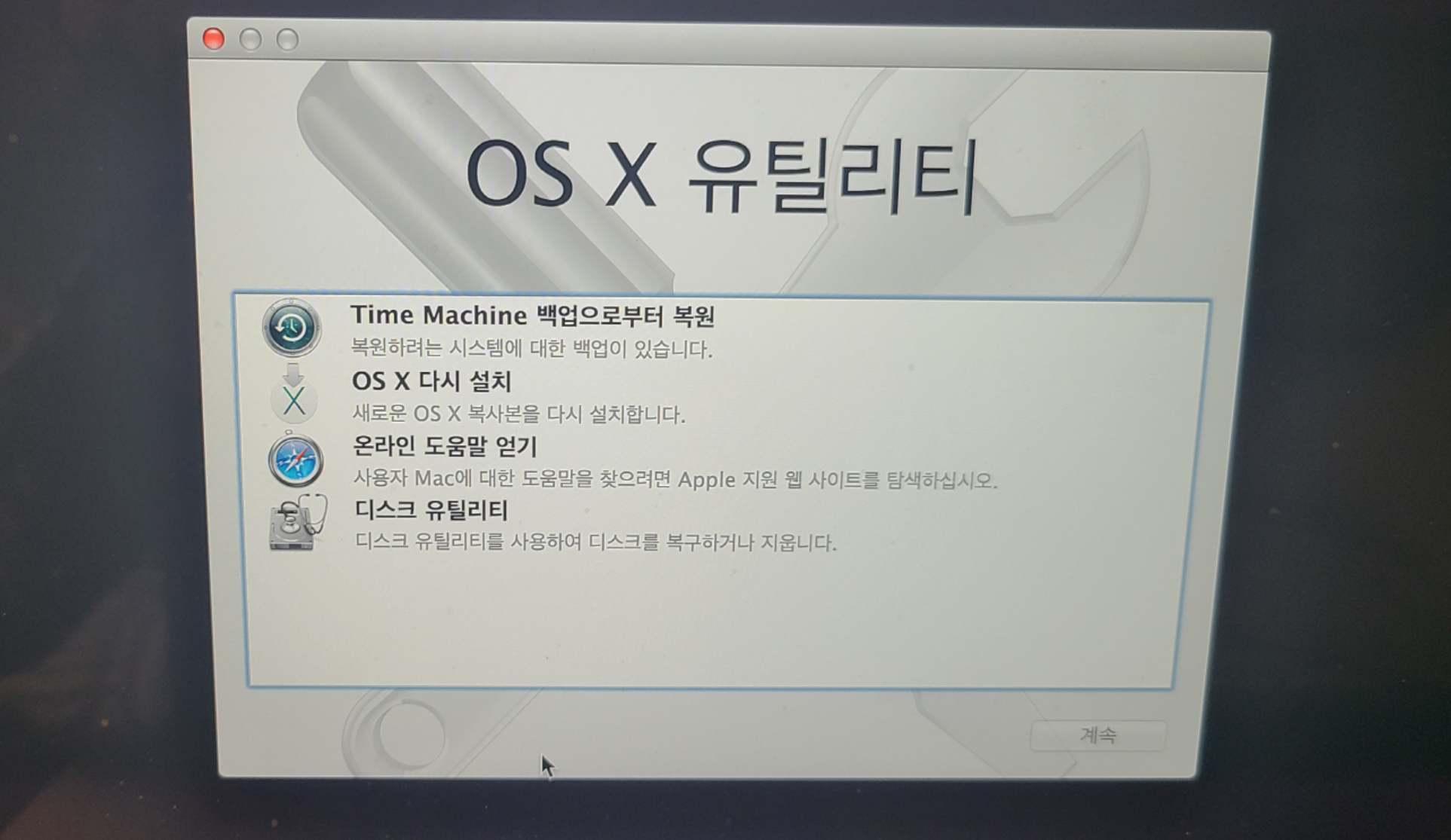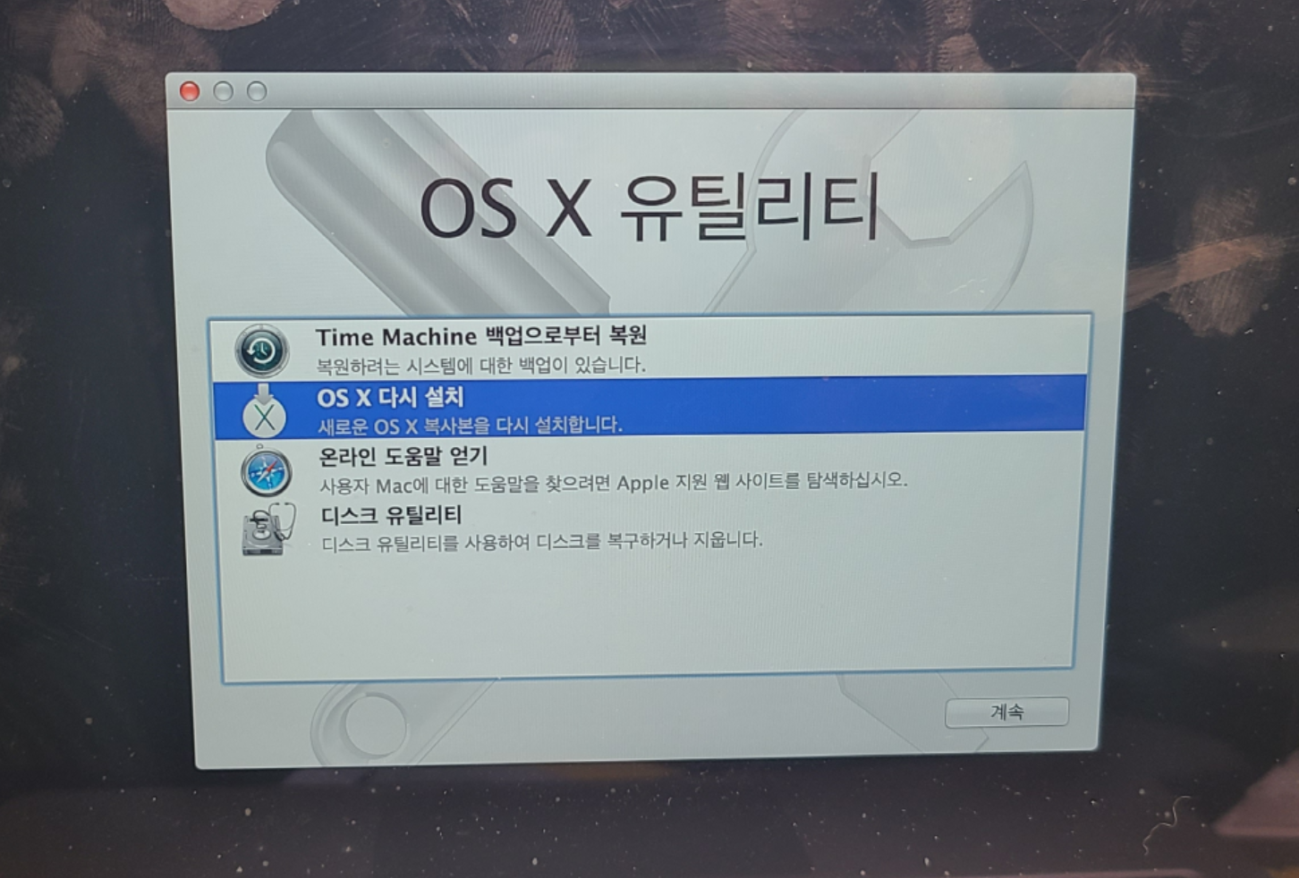 - 위 창을 닫고, 유틸리티 화면에서 'OS X 다시 설치'를 클릭합니다.