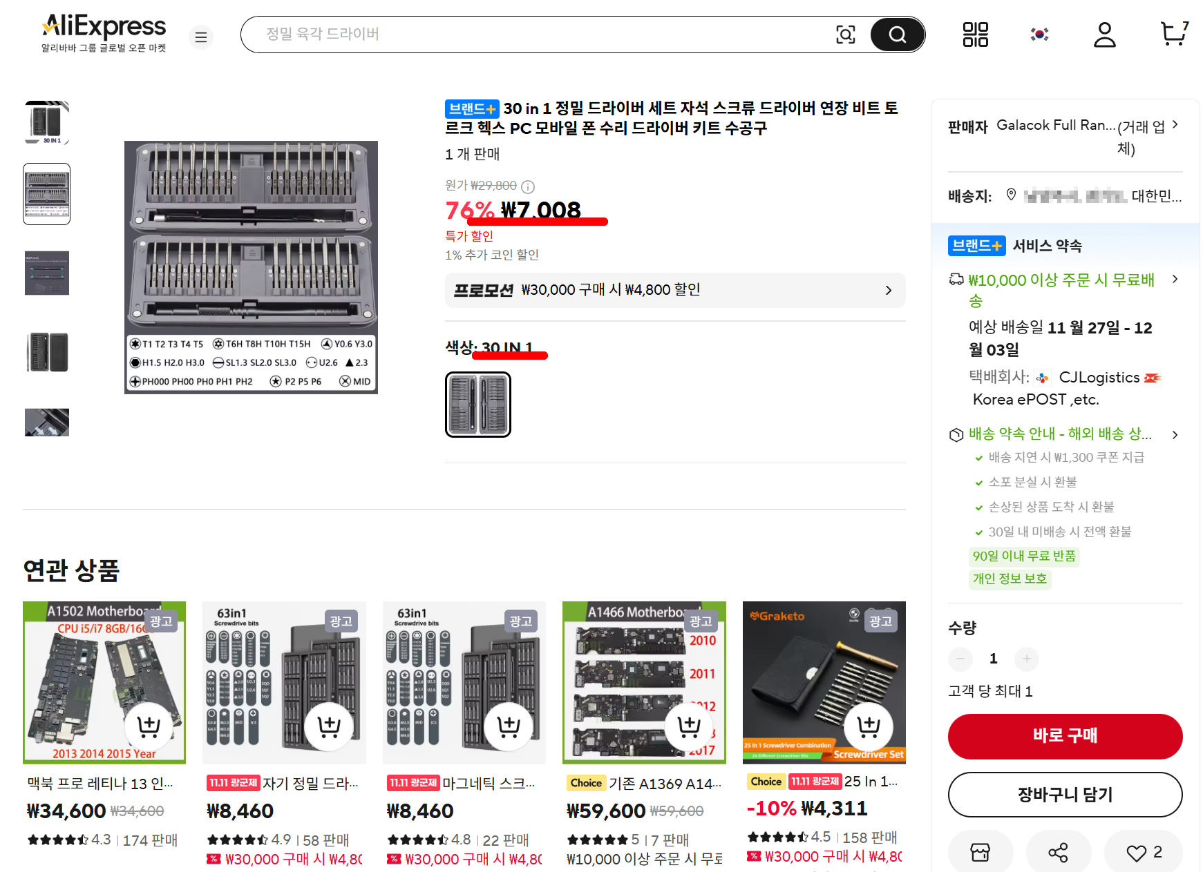 보드와 도구들을 주문했습니다. (사실 먼저 전원 커넥터 부품을 구매해서 교체해봤으나 동일 현상.)