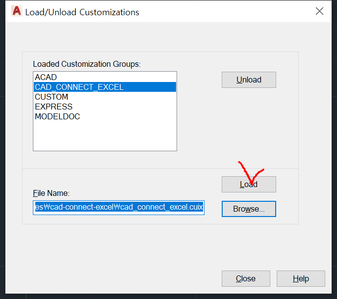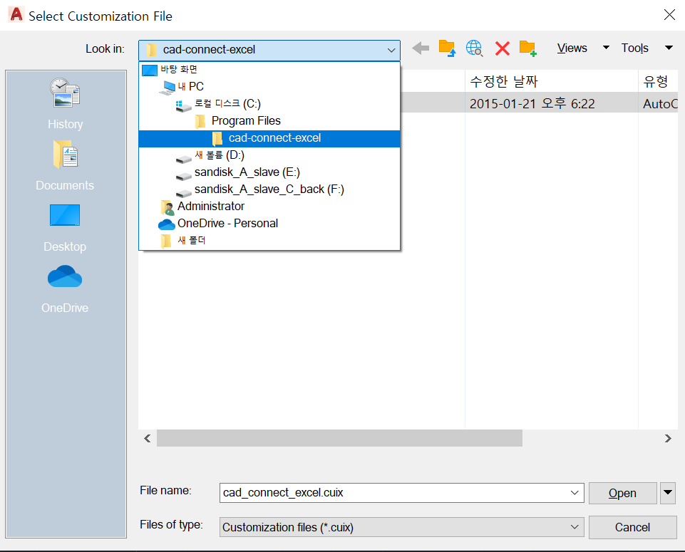 6. 위에서 옮겨놓은 폴더를 찾아 갑니다. cad_connect_excel.cuix 라는 녀석을 선택해줍니다.