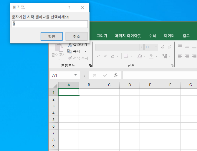 14. 첫 번째 열, 첫 번째 행 ($A$1) 하나만 선택하고 '확인 버튼을 누릅니다.