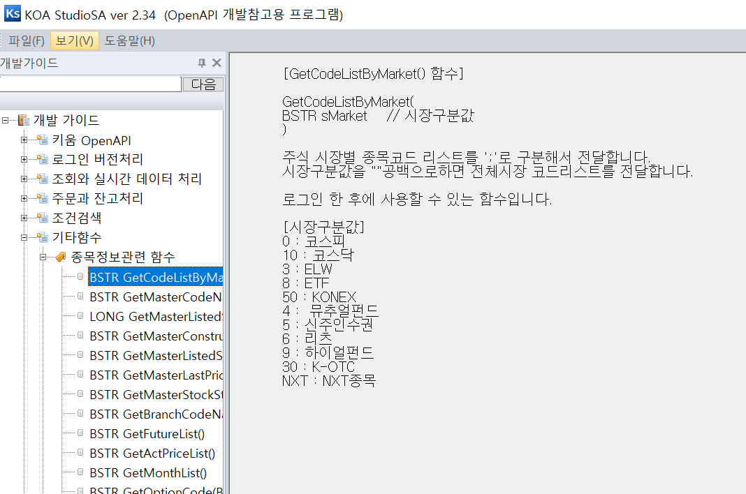 - 종목 코드 리스트를 전달하는데, 시장구분값을 정할 수 있다. (코스피, 코스닥, ELW 등등)
