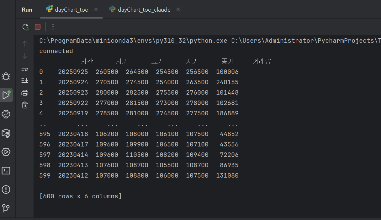 - 좌측부터 날짜, 시가, 고가, 저가, 종가, 거래량 이 불러와졌다.