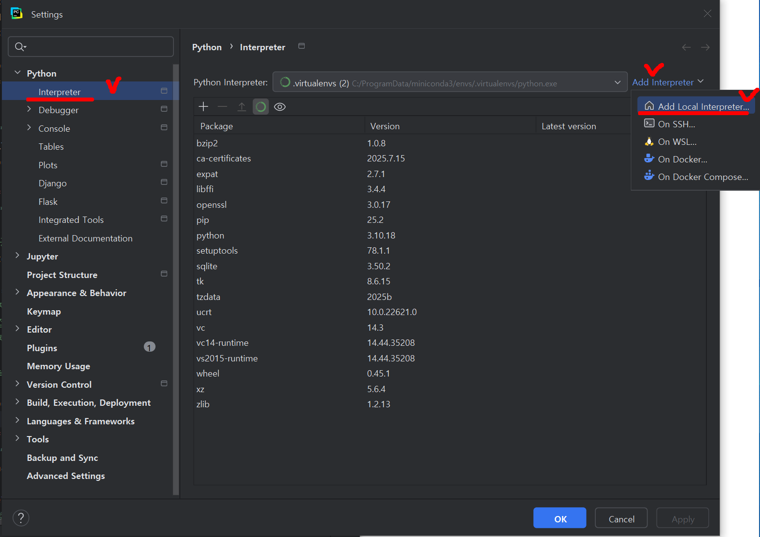 - Python / Interpreter / Add Interpreter / Add Local Interpreter