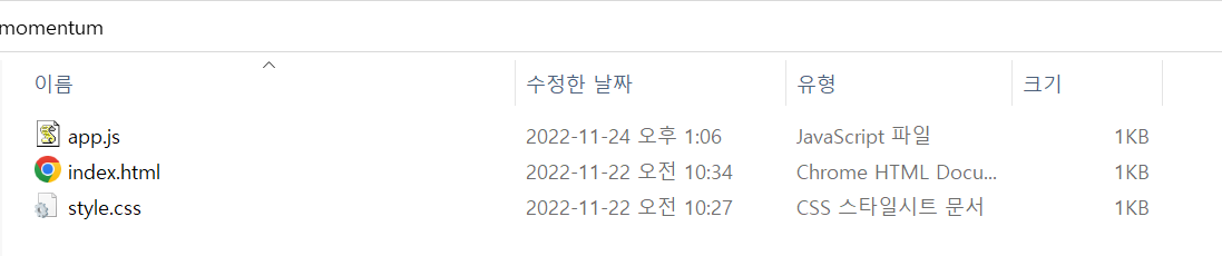 momentum이라는 폴더를 만들고, 그 안에 html 파일과, css파일, js파일 이 세 가지를 임으로 만든다.