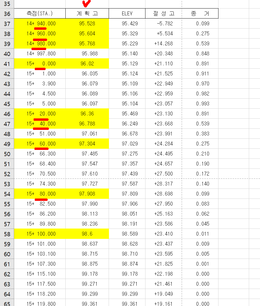 - 보통 측점이 20m 단위로 쭉 만들어져있지 않기 때문에 아래처럼 노란색 부분(20m 단위)만 발췌하여 정리해야 합니다.