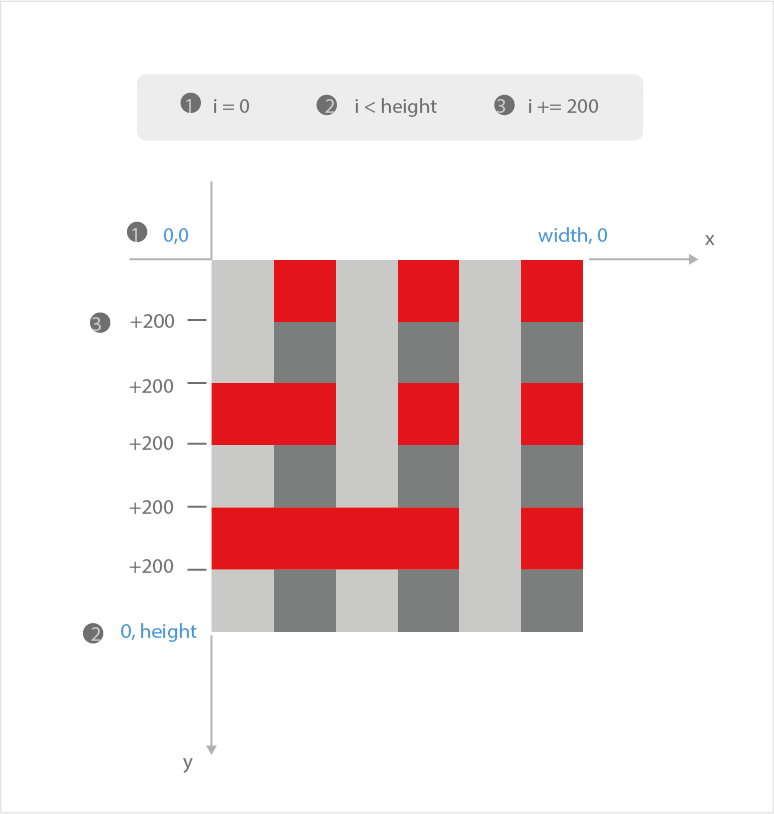for (int i = 0; i < height; i += 200) {      // 변수 i는 0에서 시작. 세로 값에 이르면 종료. 200씩 증가.