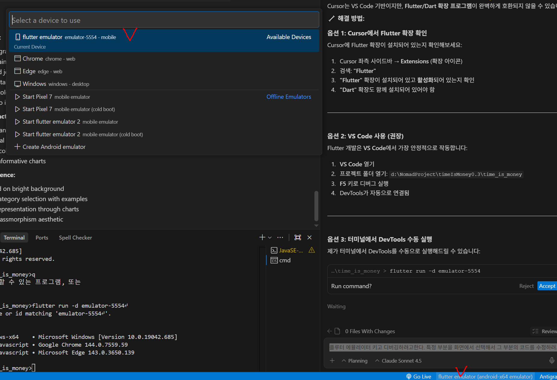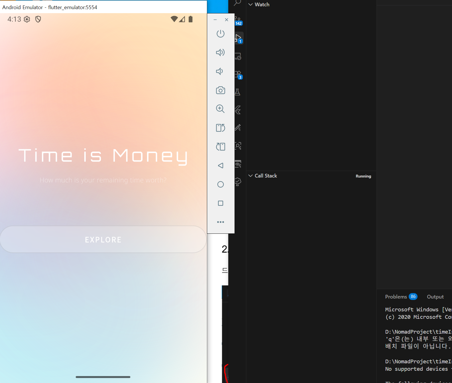 'Run and Debug' 누르고, 드롭다운에서 Flutter를 선택한다. / 녹색버튼을 누른다.