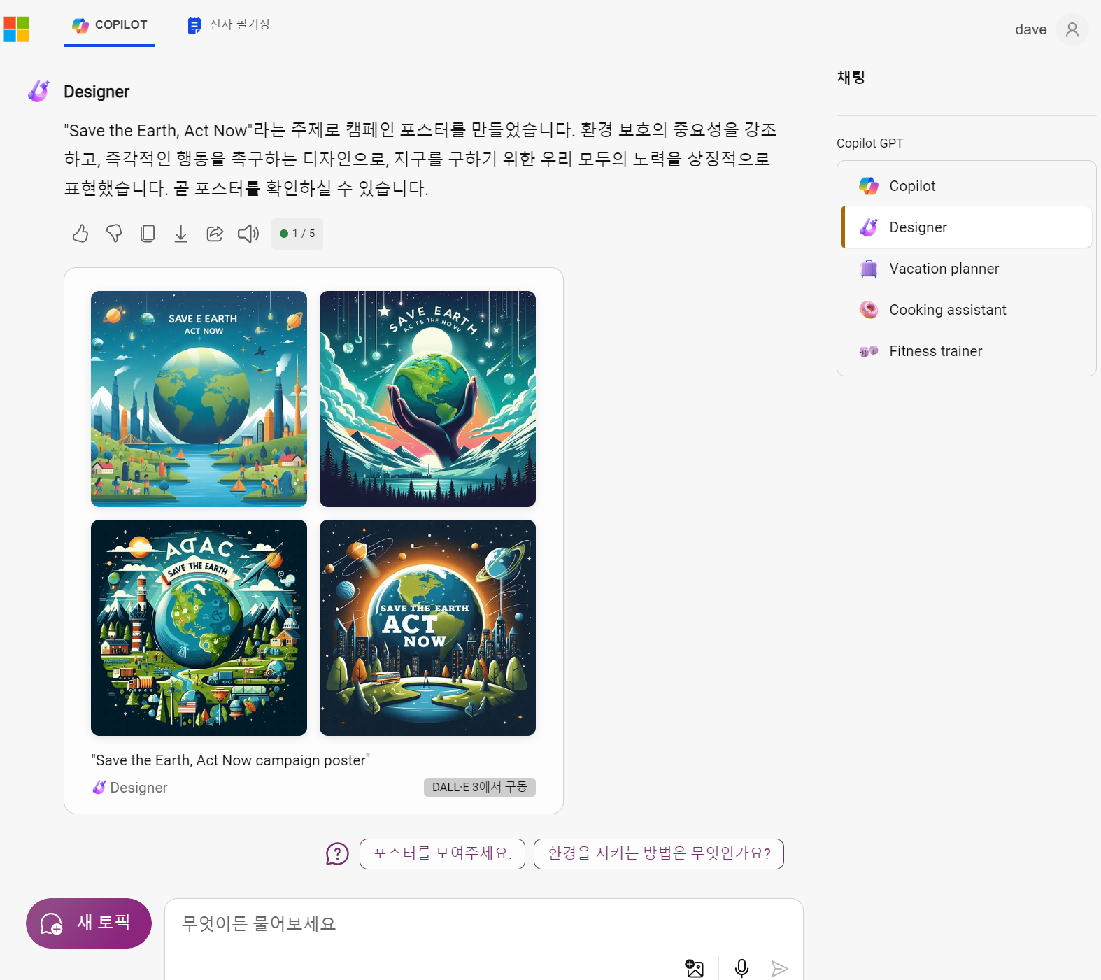 " save the earth act now 를 주제로한 캠페인을 위한 포스터"라고 요청해봤습니다.