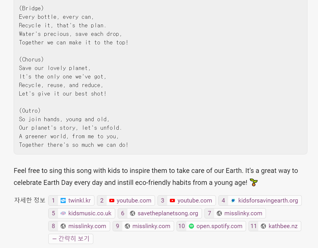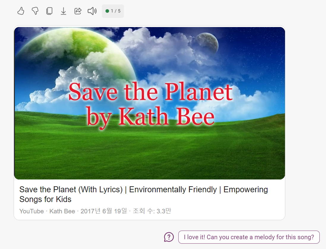 "save the planet song for kids lyrics" (지구를 구하는 노래 아이들용 가사)라고 요청해봤습니다.