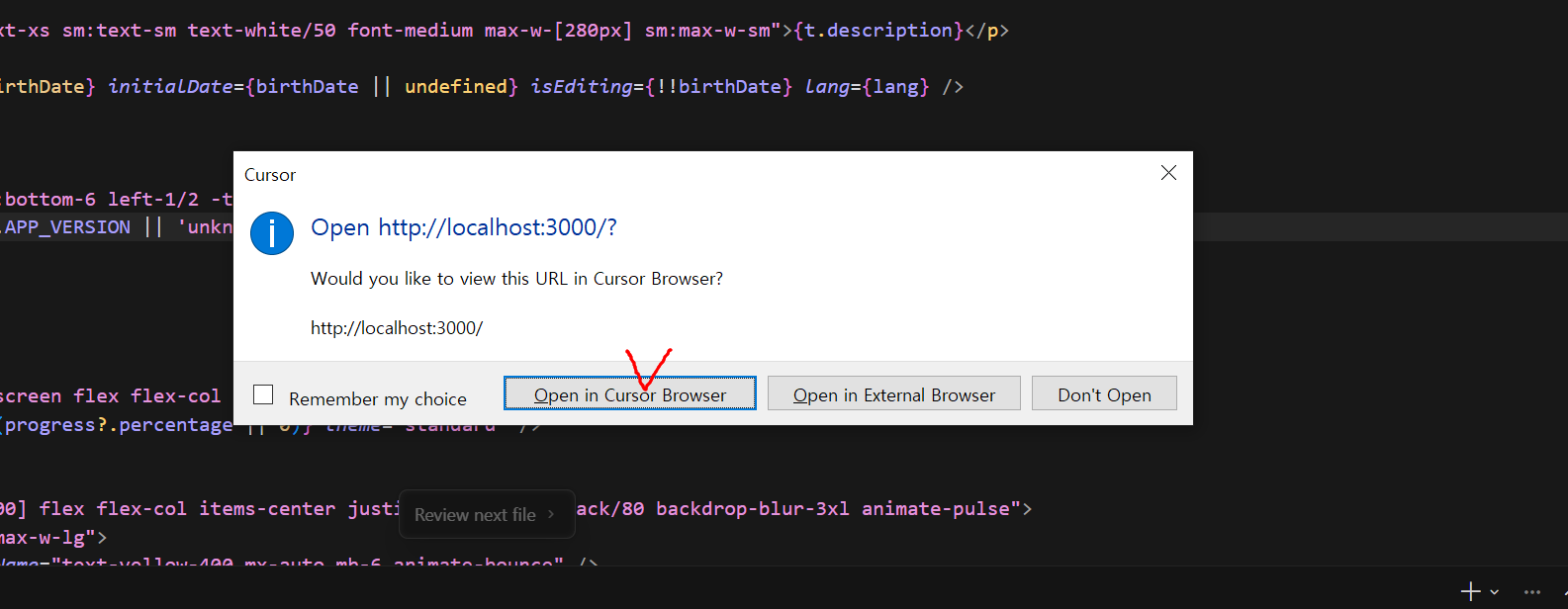 - 커서 내부 브라우저를 열게합니다.