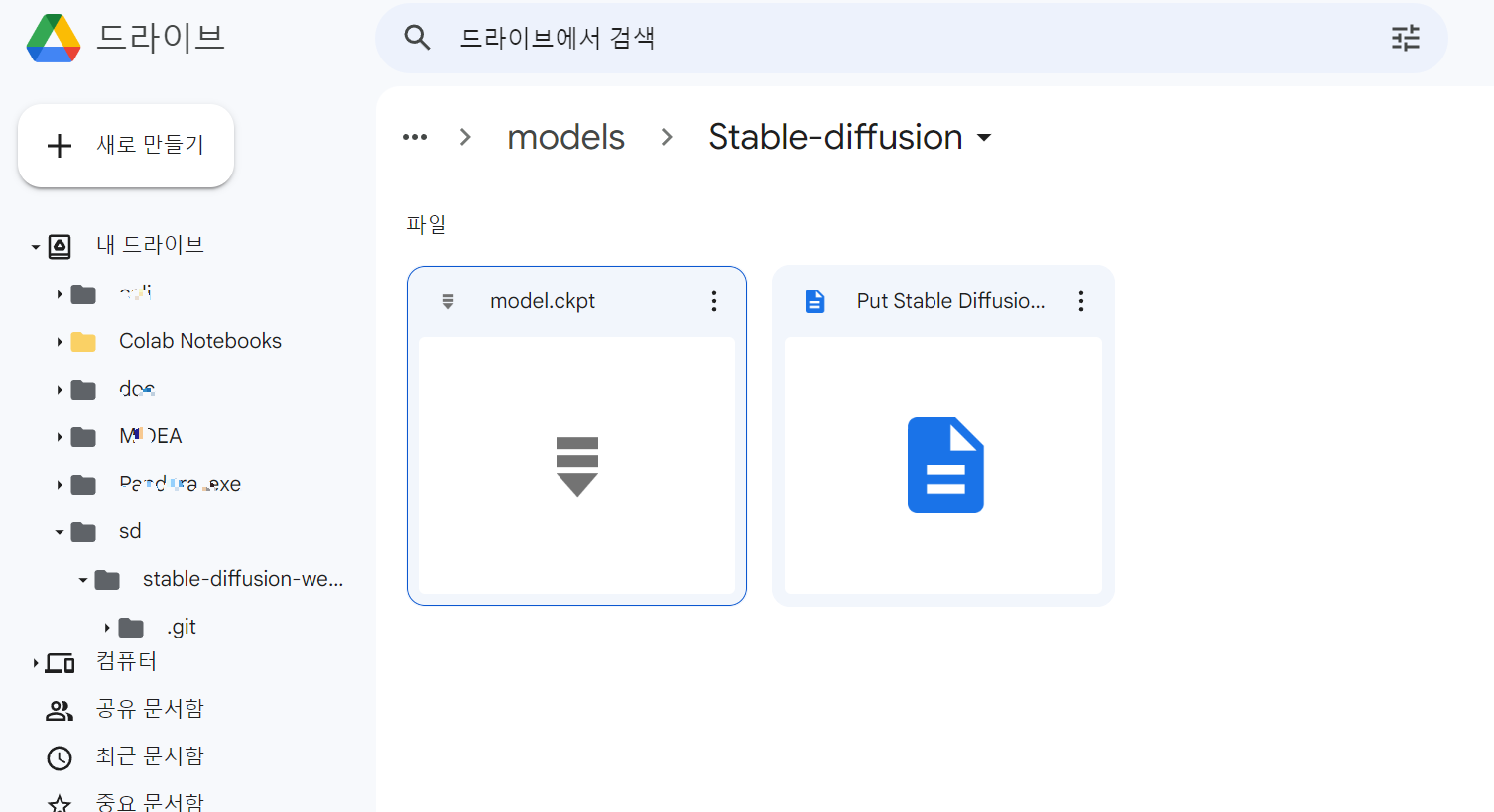 다운로드 받은 모델은 어디에 저장되었느냐? 내 구글 드라이브에 SD란 폴더가 생겼을테고요.