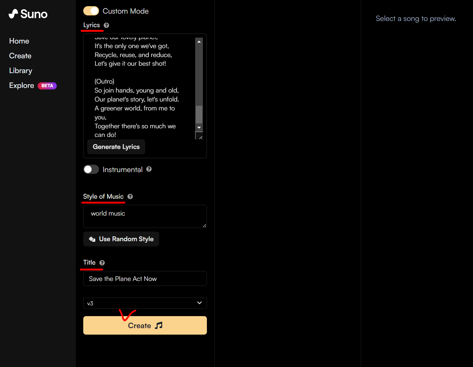 위의 가사를 붙여 넣었고, 월드 뮤직 스타일을 입력했으며, 제목도 넣어준 뒤, Create를 해줍니다.