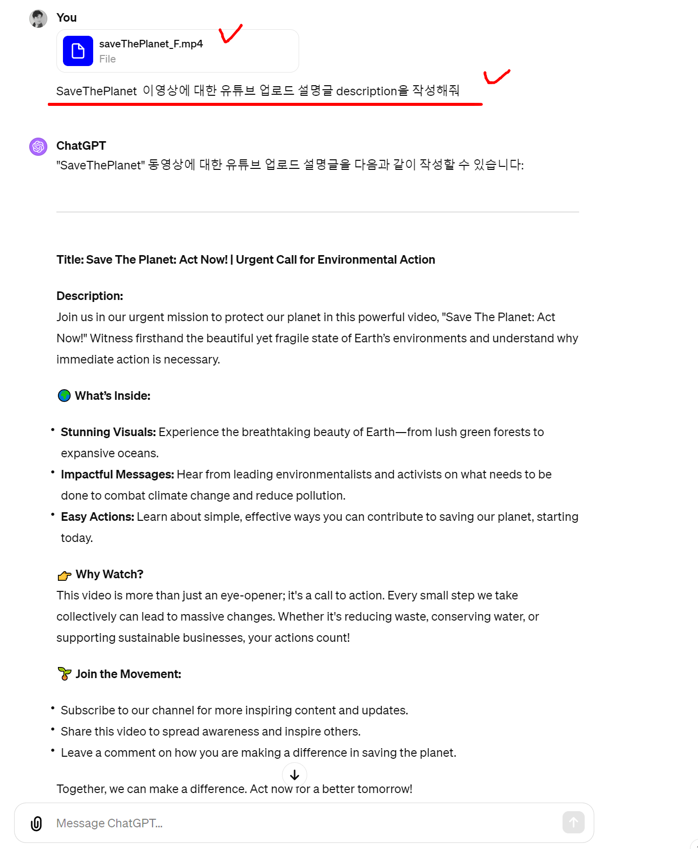 GPT에서 동영상을 올리고, 유튜브 설명글을 작성요청했습니다.