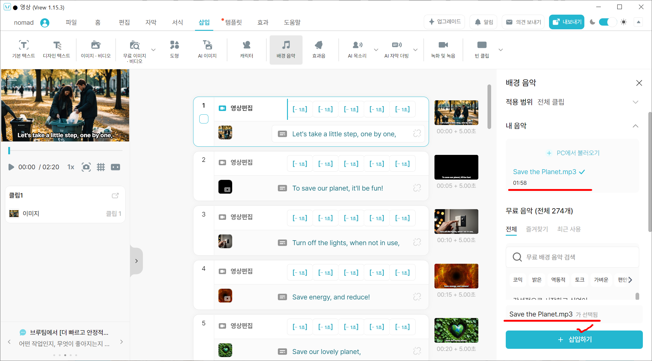 7) 제가 만든 음악 파일을 PC에서 선택하고 삽입하기 버튼을 누릅니다.