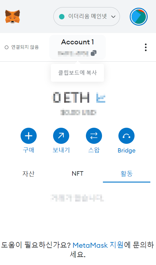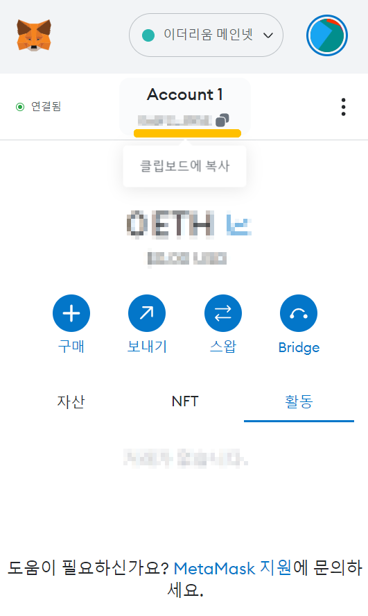 *지갑이 이더리움 네트워크인지 다시 한 번 확인합니다.