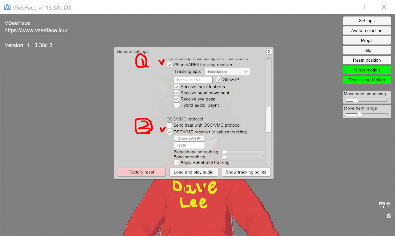 3) VseeFace를 실행한 뒤, 설정 / 일반에서 중앙즈음에 OSC/VMC receiver 옵션을 켜줍니다.