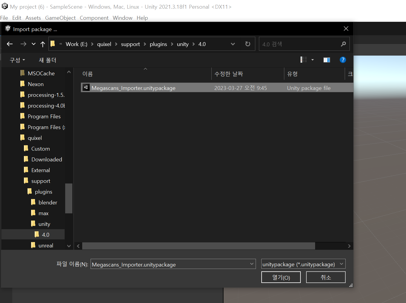 1) 혹시 몰라 유니티에서 불러보겠음. 유니티 실행 후 패키지 임포트!