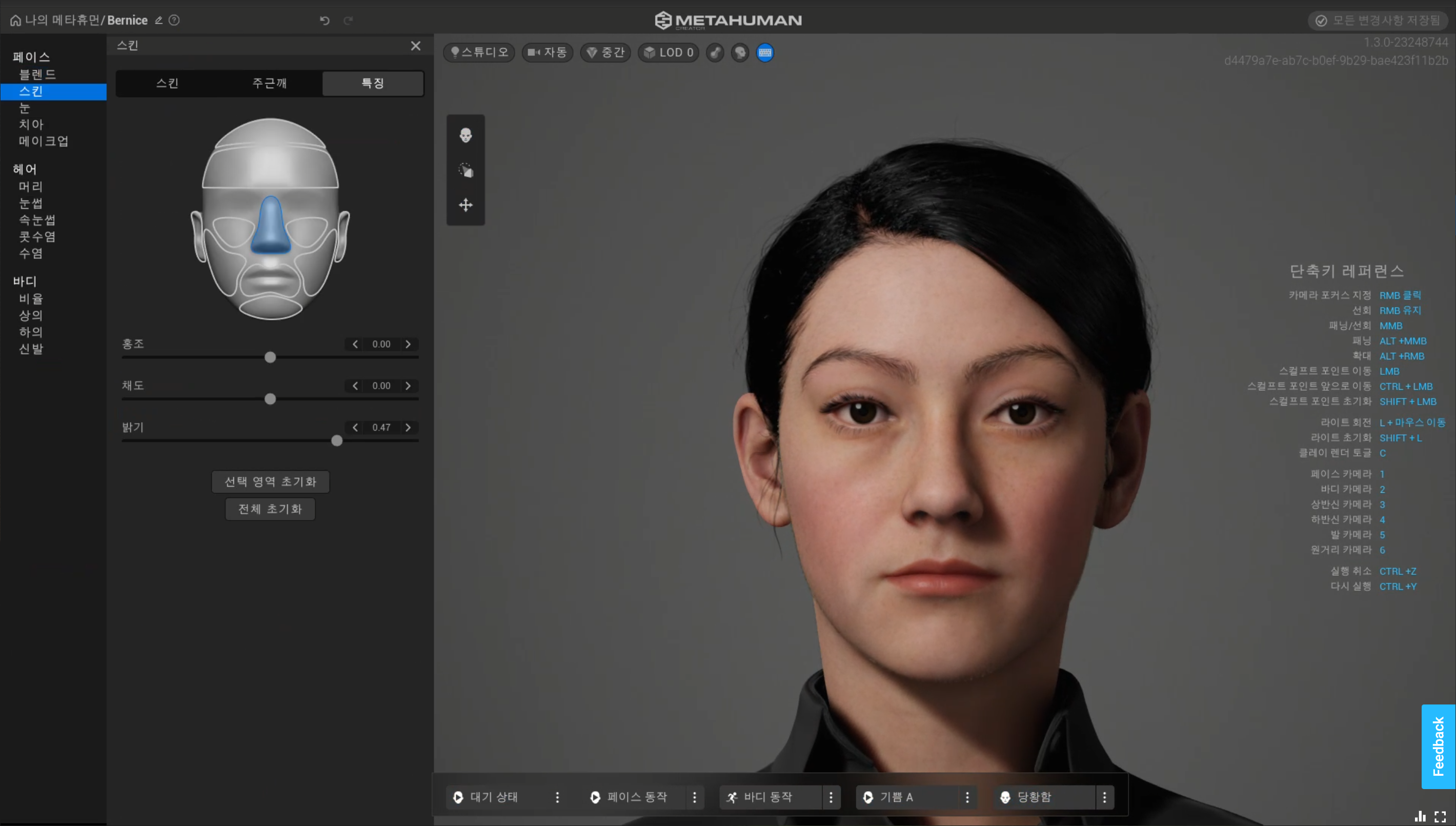 7) 스킨 : 피부색 나이든 표현, 주근깨 추가, 홍조, 채도, 밝기 등을 조절