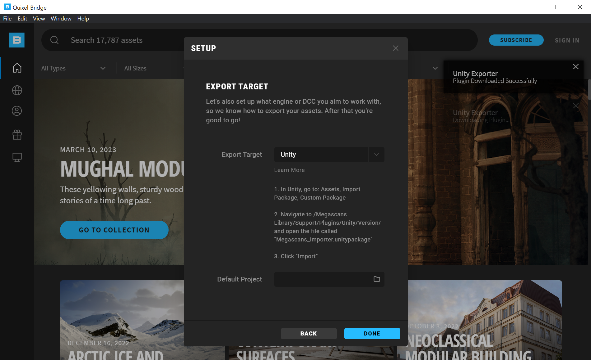 설치한 후 실행되면 세팅에서 export target을 unreal, unity, maya 등등 으로 선택 가능함