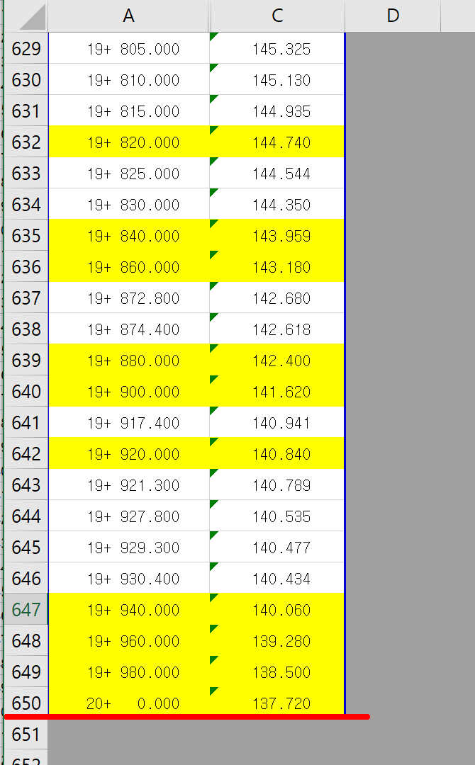4)불필요한 '행과 열'을 모두 삭제하니, 측점과 계획고만 남긴, '2열 650행'으로 정리되었습니다.