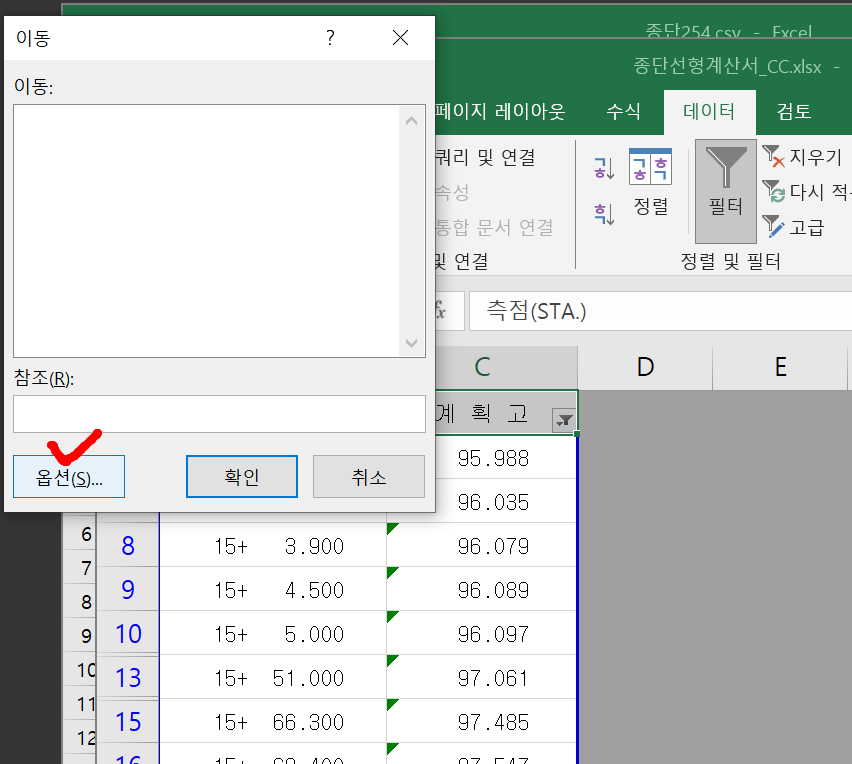 '선형계산서' 엑셀 데이터를 '스테이션 20m' 단위로 엑셀파일 정리하기 위해 '필터를 사용하는 방법'입니다.