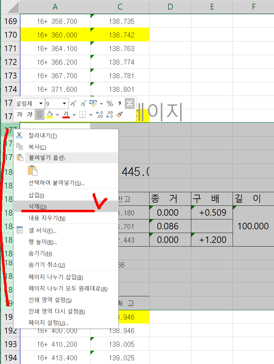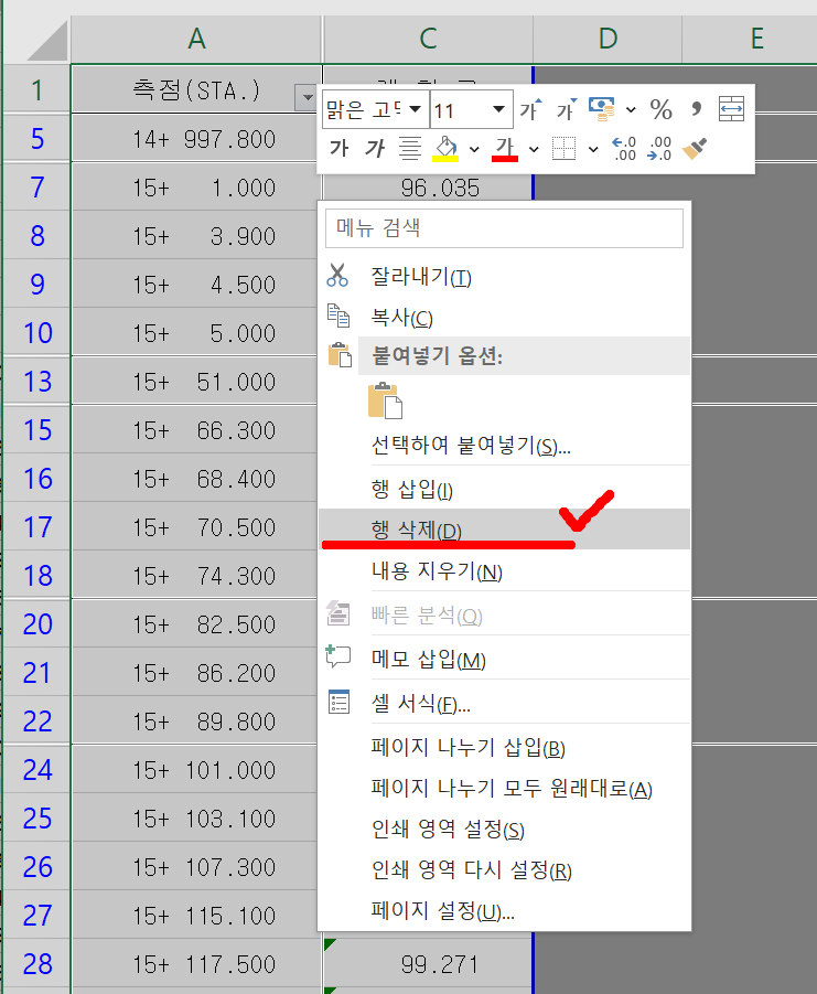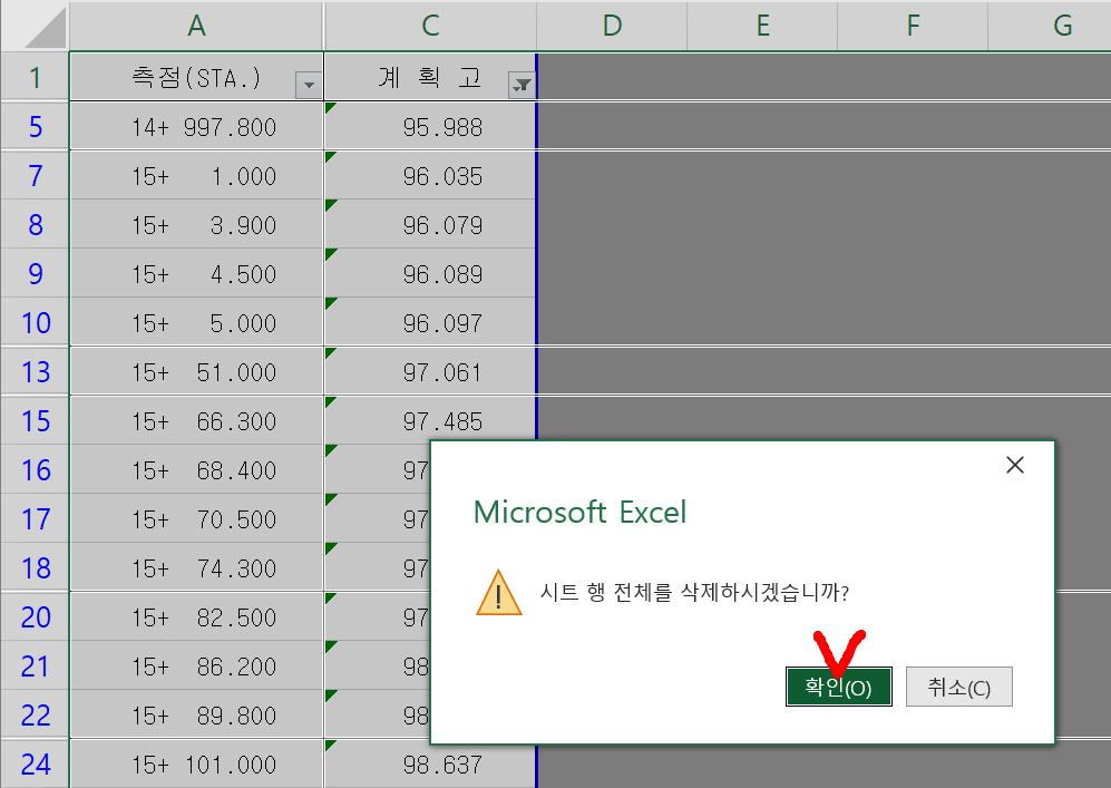 1) 측점 확인을 위해 남겨두었던 'A'행을 삭제합니다.