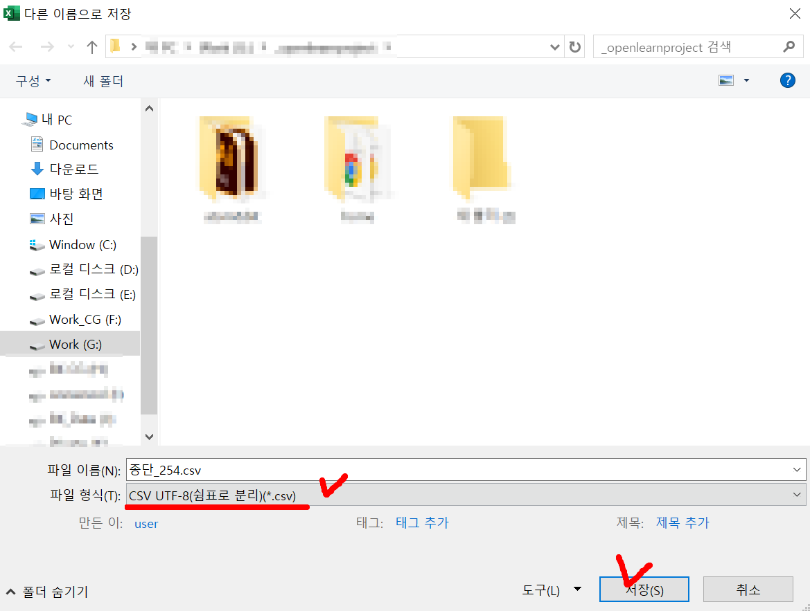 1) 확장자를 '*.csv'로 선택한 후 저장합니다.