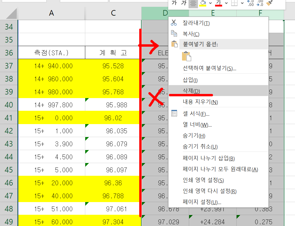 1) 1행의 '측점', '계획고' '셀 두 개' 선택