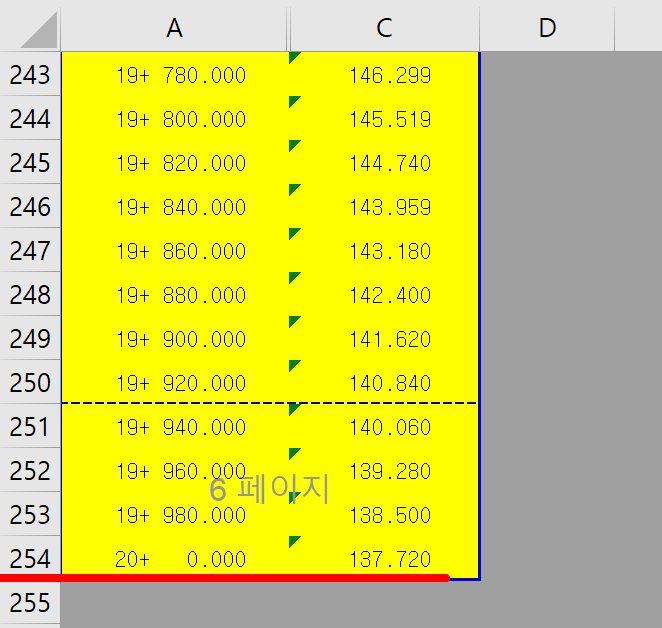 1) 우선 '측점 STA. 열'의 20m 단위로 셀 컬러를 노란색으로 바꿔줬습니다.