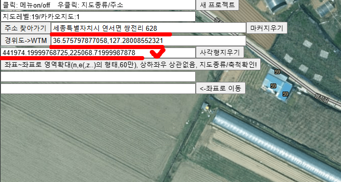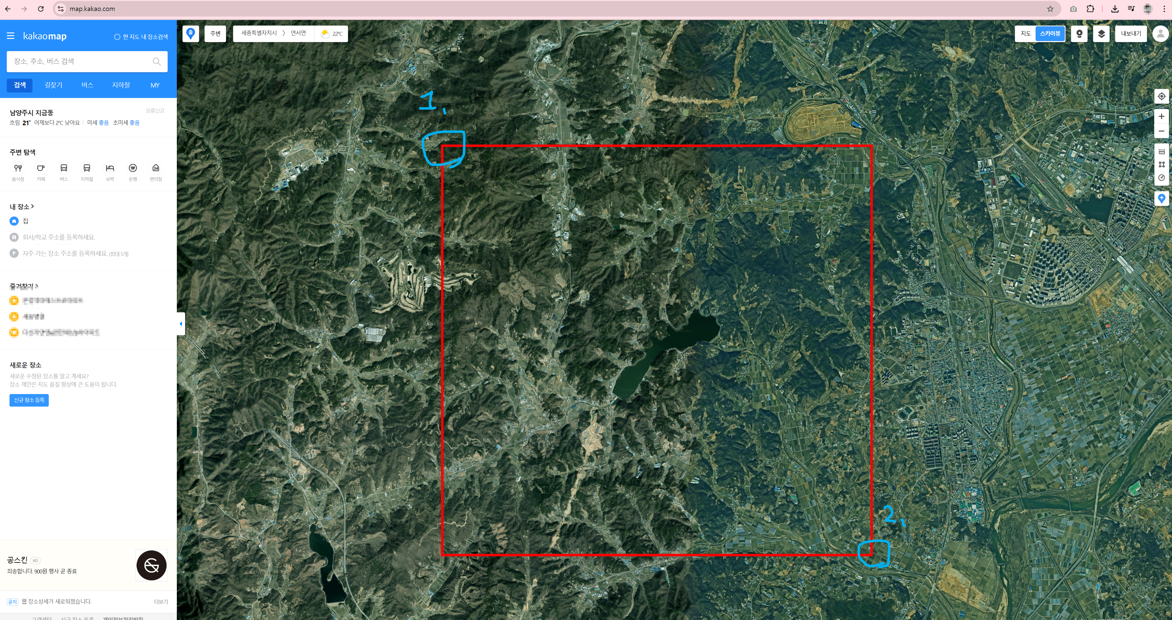 - 카카오 or 네이버지도를 열고 원하는 위치의 좌측 상단 위치의 주소를 찾아냅니다.