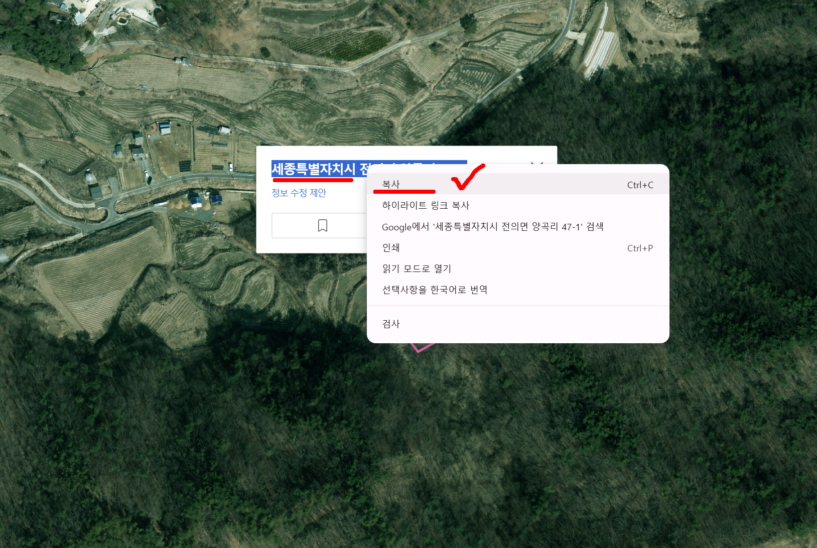 - 2.번의 주소도 마찬가지로 찍어서 '주소보기' 하여, 복사합니다.