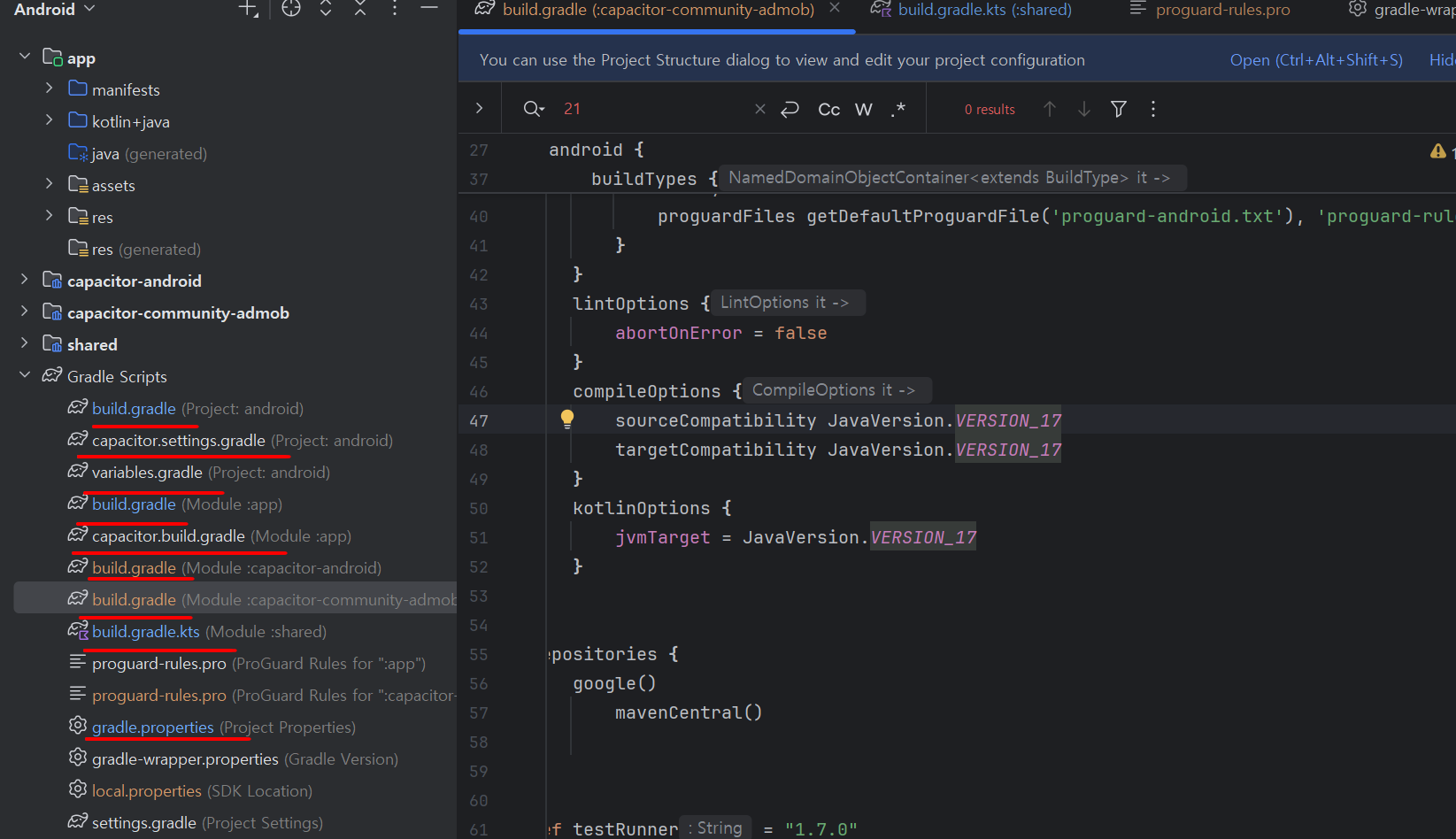 자바(Java) 컴파일러 버전(21)과 코틀린(Kotlin) 컴파일러 버전(17)이 서로 달라서 발생하는 문제