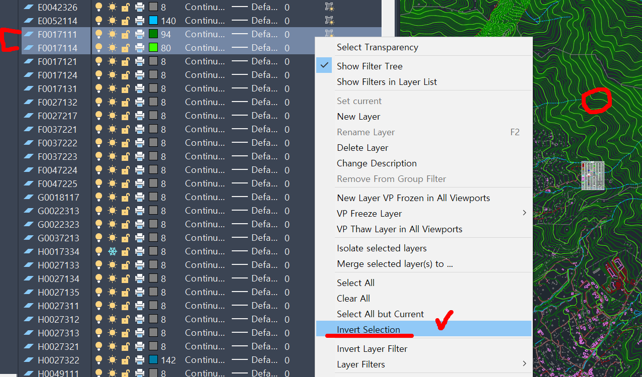 1) Property 창에서 등고선에 해당하는 2개의 레이어를 선택 후, 반전 선택