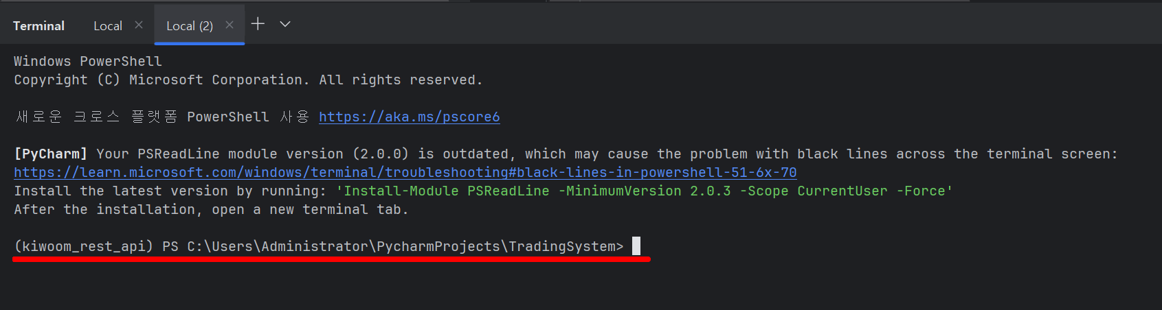 - Terminal / 새로열기(+) 하면 아래처럼 Kiwoom_rest_api 환경이 설정됨을 보여줌