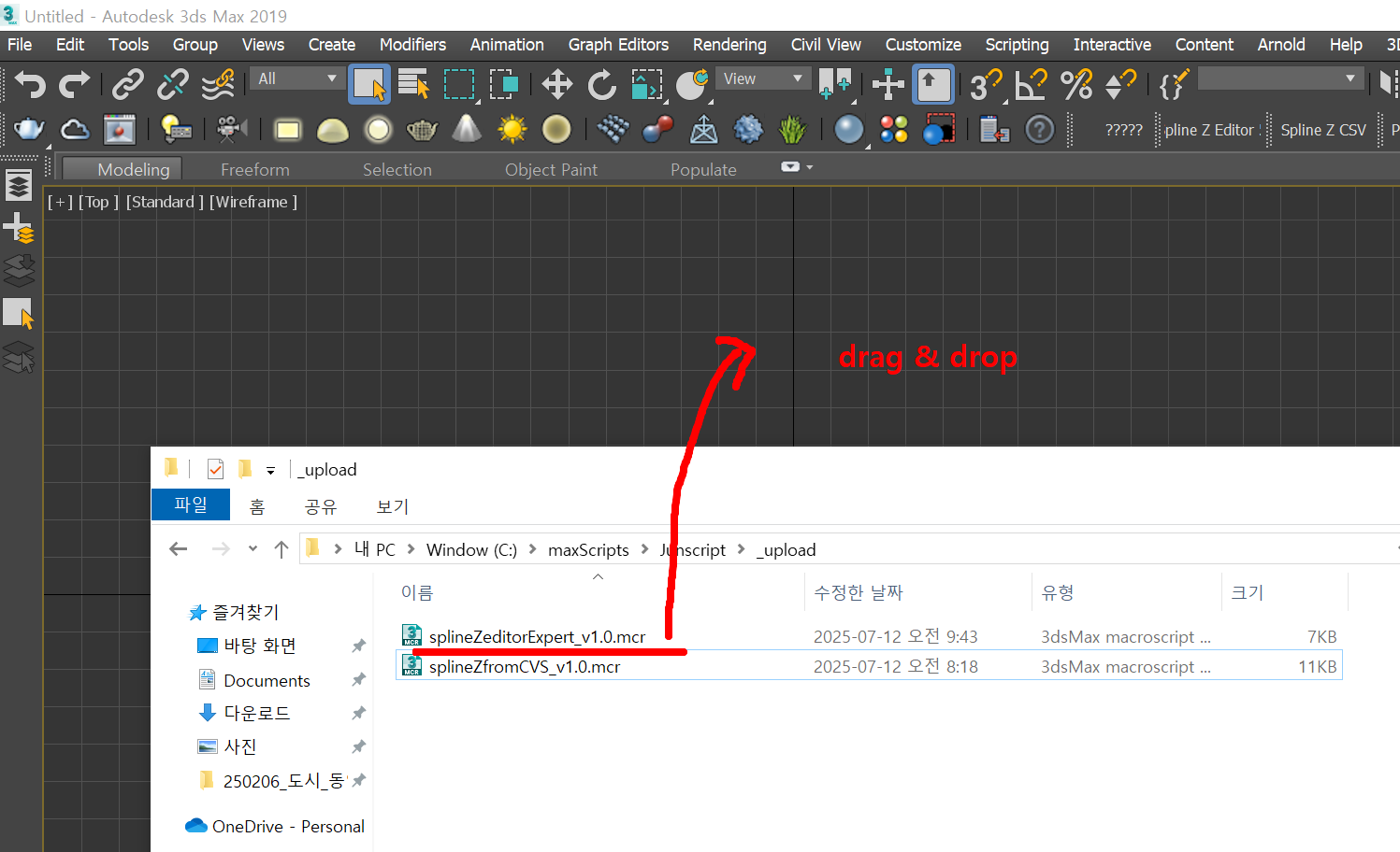 - 윈도우탐색기에서 맥스 뷰포트창으로 스크립트 파일( *.mcr파일)을 드래그 앤 드롭하여 놓습니다.