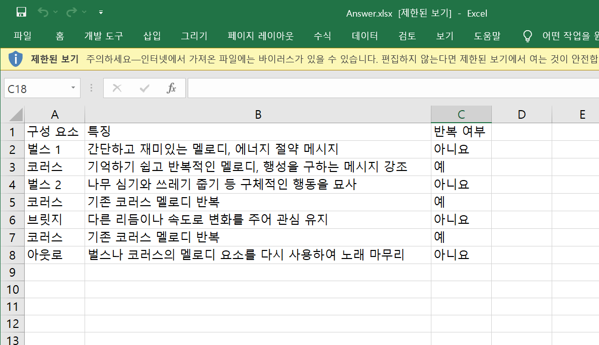 6. 가사의 구조를 엑셀표로 정리해달라고 합니다.