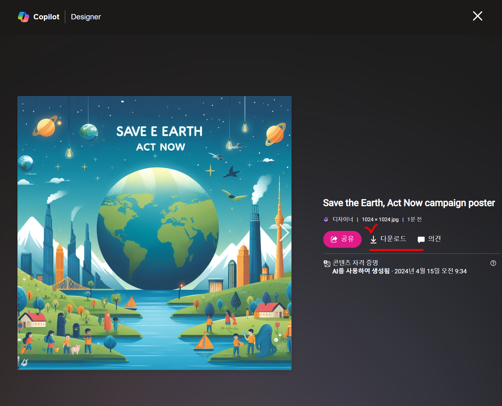 8. 생성된 이미지 중에서 하나를 선택하여 다운로드 합니다.