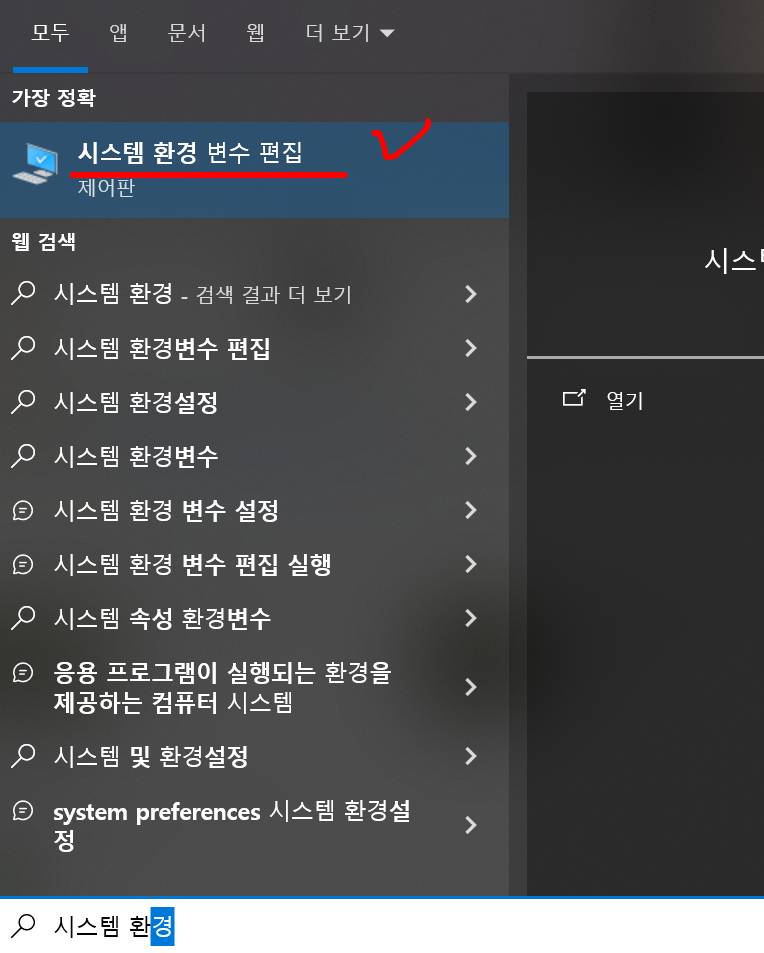 윈도우 시작 버튼을 눌러 "시스템 환경... " 찾아보면 다음과 같은 메뉴를 찾을 수 있습니다.
