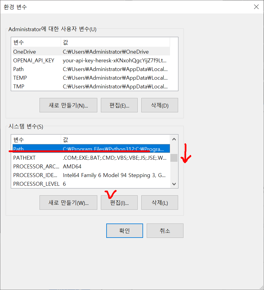 변수에서 Path 부분을 찾아서 선택하고, "편집"버튼을 누릅니다.