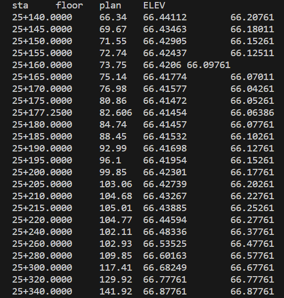 이 파일은 도로설계를 위한 station 마다의 지반고, 계획고를 추출한 데이터를 담고있다
