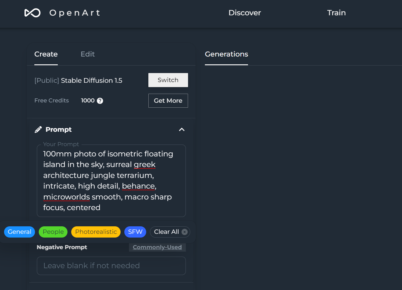 이 OpneArt 사이트에서도 해볼 수 있지만, credit의 제한이 있습니다. Free는 1000개 크레딧이 있죠.