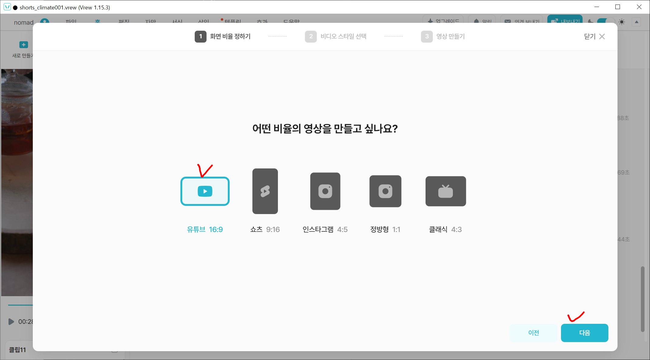 3) 영상 비율 가로 16:9로 정하고 "다음"버튼을 누릅니다.